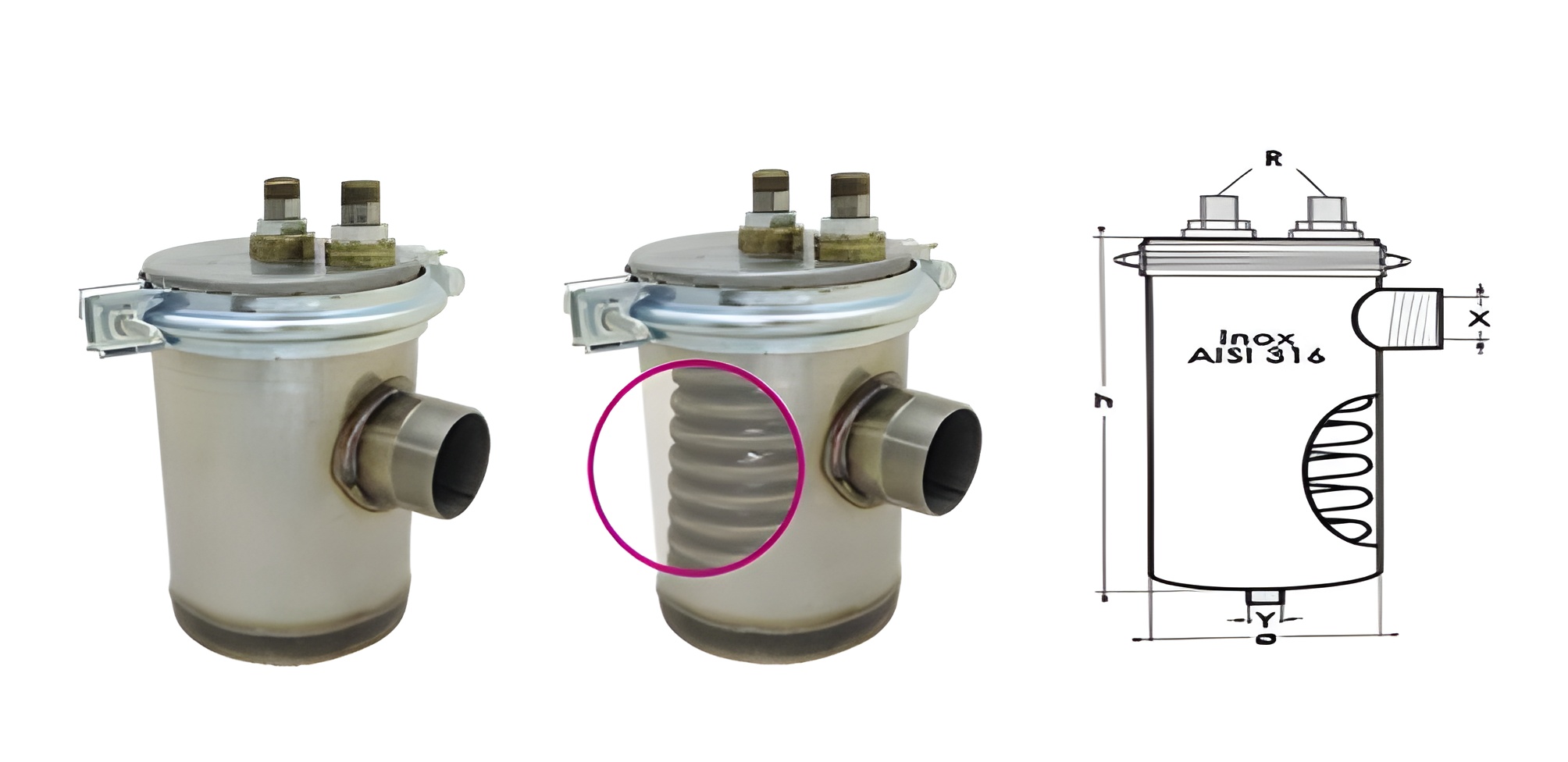 CONDENSATORE COMPLETO PM6 INOX R 1/2″ – X 2″ – Y 1″ – H=220mm Ø 150mm