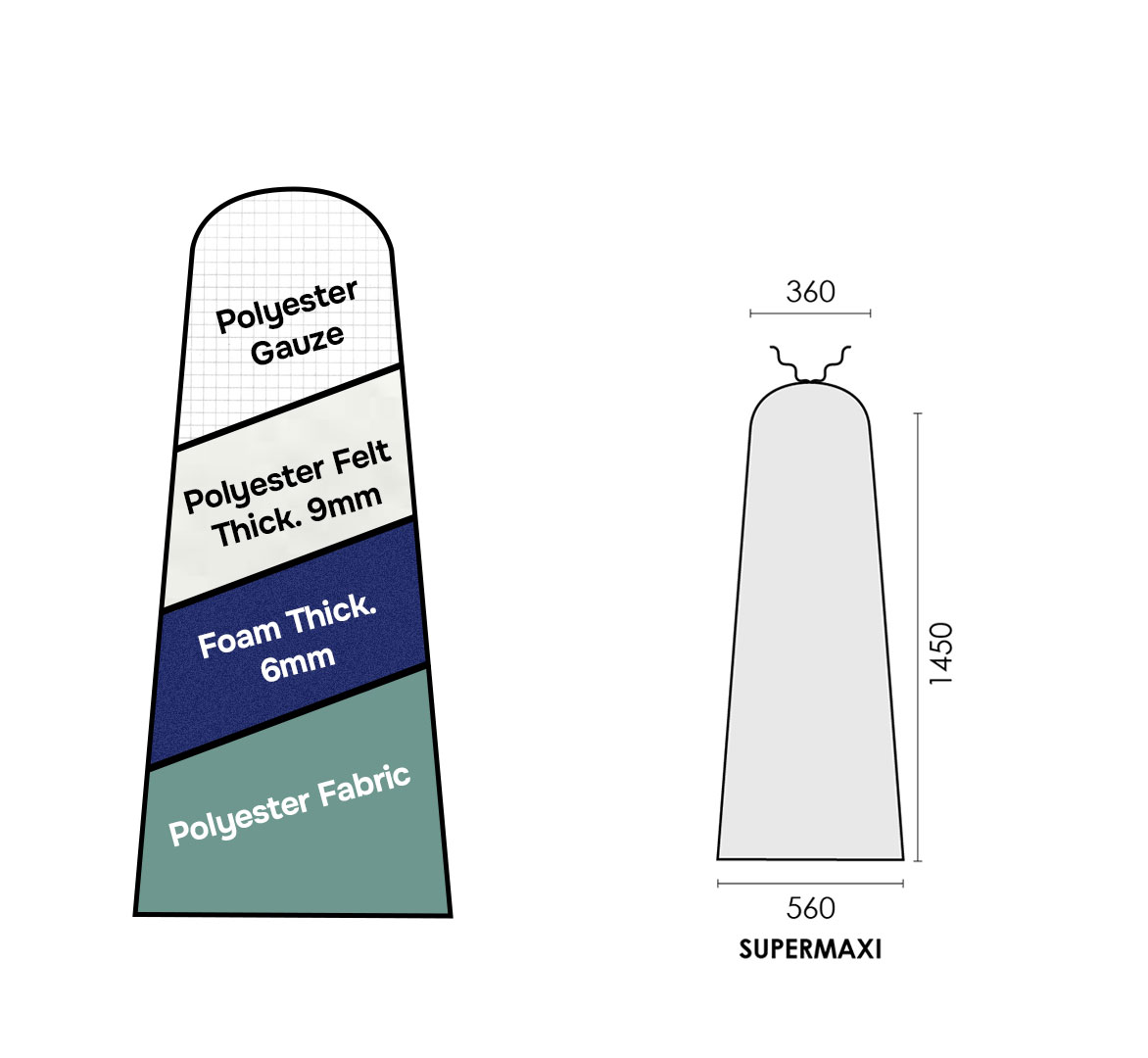 “ULTRA”: tessuto poliestere + spugna spessore 6mm + mollettone spessore 9mm + rete poliestere